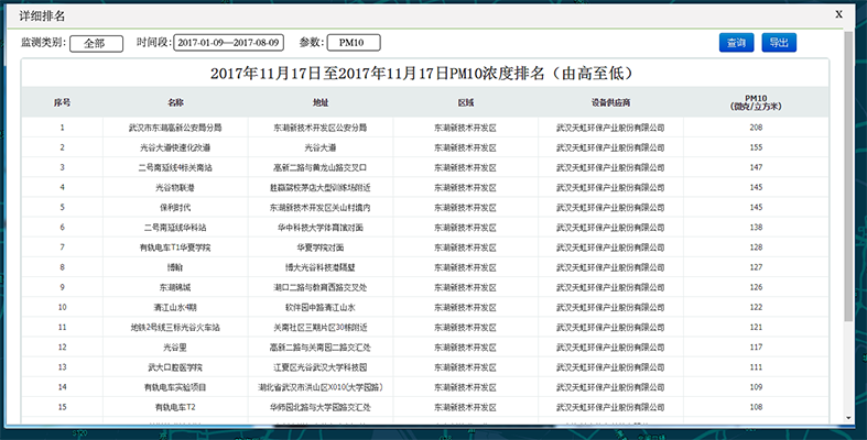 1. 可以對各個監測點位進行PM2.5或者PM10參數進行實時簡單排名或者歷史簡單排名,可以正序也可以倒序。以此可以快速地了解各個監測點位的排名。