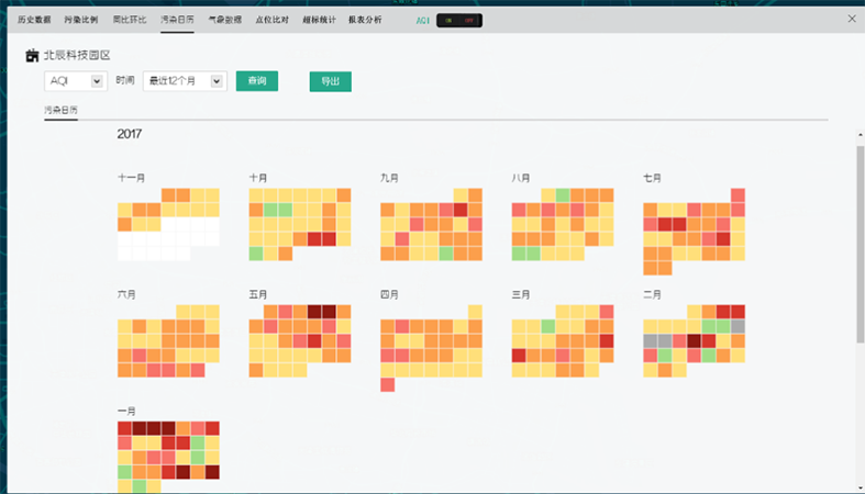可以對PM2.5、PM10的歷史總結成日歷的形式,能更直觀地看到歷史上每天的數值情況。