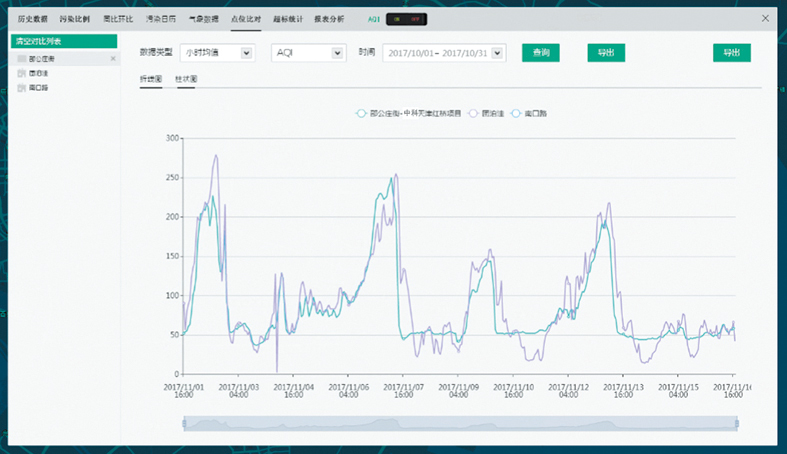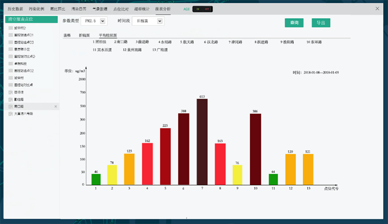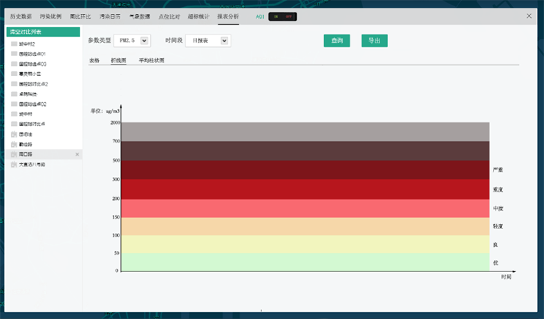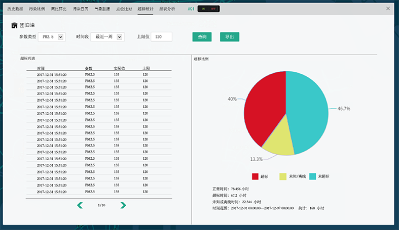 可以對特定的點位按選定的時間段進行超標統計,以表和圖兩種方式同時顯示。通過圖可以直觀地看到超標的情況,通過表可以詳細查看什么時間出現的超標。