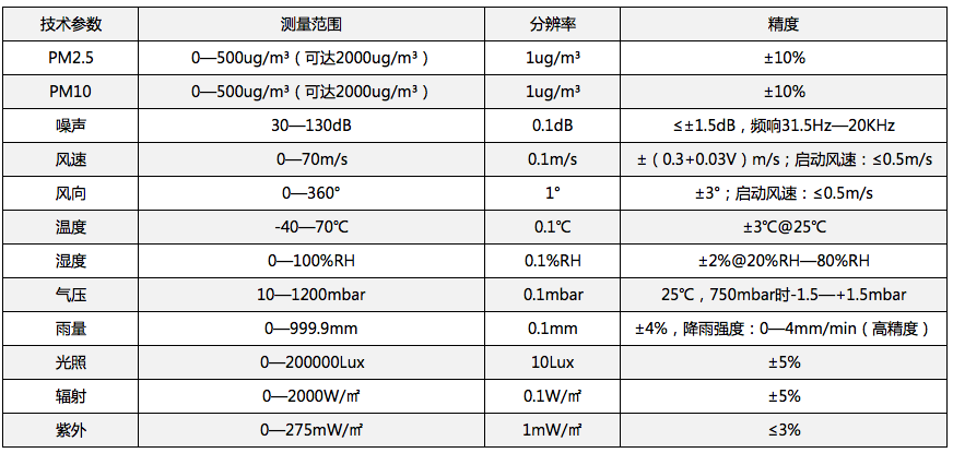 CS-JG系列軍工超聲波氣象站可以監測風速、風向、溫度、濕度、氣壓、雨量、紫外、輻射、光照、PM2.5、PM10和噪聲等指標。由于采用鋁合金材質,使得設備具有堅固耐用,壽命長等特點,可以提供可靠的測量數據。參數模塊可進行靈活搭配,而且體積小、功耗低,適用于高端揚塵的布點監測。