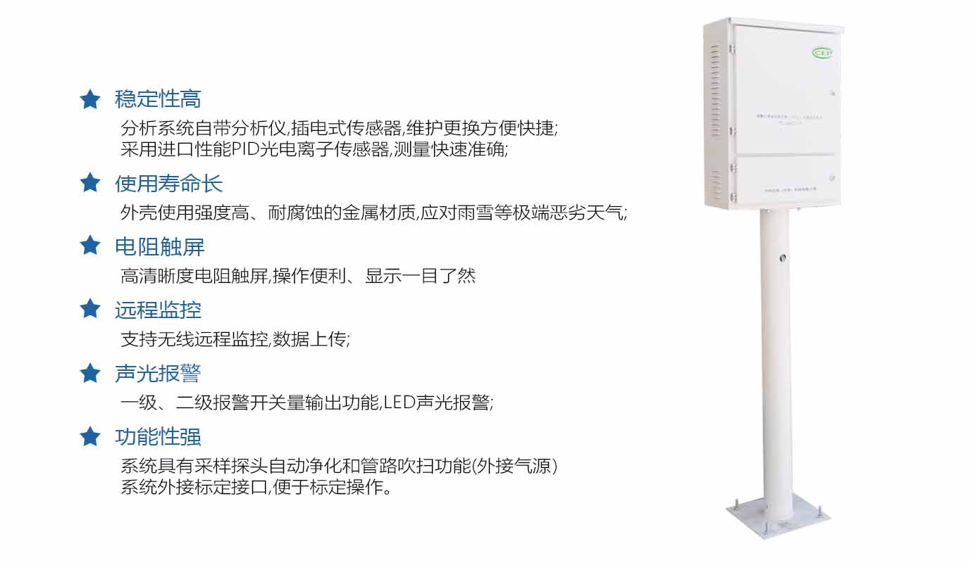 voc尾氣在線監測系統是多種揮發性有機化合物的總稱,采用獨創的核心算法,實現分辨率1ppb的高精度檢測,可達國控站監測指標,同時該設備獲得CCEP中環協認證證書 ,系統采用特殊方法采樣,氣體經過降溫、干燥、過濾預處理,再通過PID變送器測得氣體的VOC的濃度,另外還配置智能報警燈,當VOC濃度值超過設置閾值,自動啟動報警裝置,采用模塊化結構,安裝、操作方便。