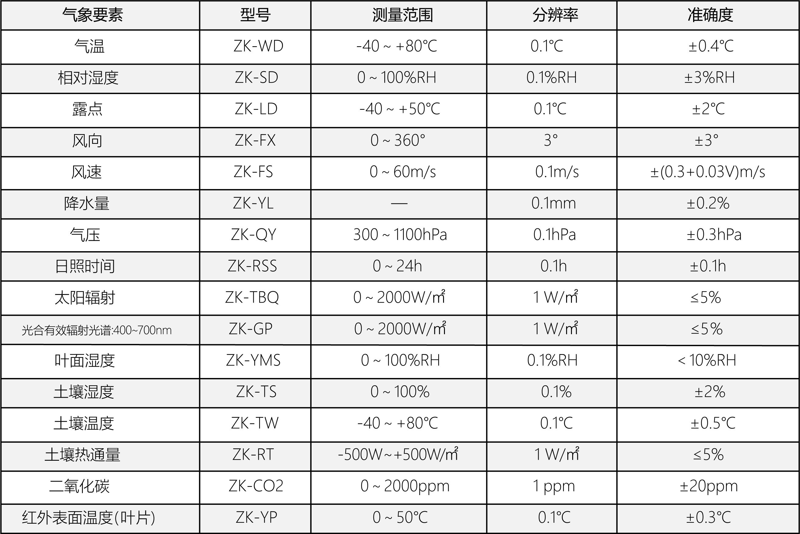 ZK-NY10A氣象站設(shè)備,農(nóng)業(yè)氣象站可對(duì)常規(guī)十二種氣象因子(大氣溫度,環(huán)境濕度,平均風(fēng)速風(fēng)向,瞬時(shí)風(fēng)速風(fēng)向,降水量,光照時(shí)數(shù),太陽直接輻射,露點(diǎn)溫度,土壤溫度,土壤熱通量,土壤水分,葉面濕度)進(jìn)行直接測量,還可以測量水面蒸發(fā),太陽光合有效輻射等多種要素。