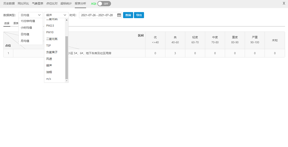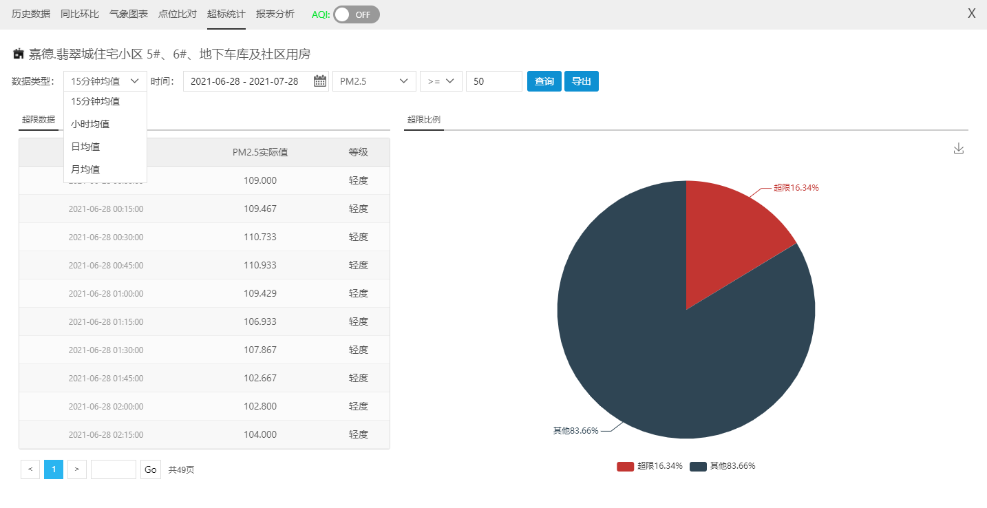 對特定點位選定時間段進行超標統計,以表和圖兩種方式同時顯示,通過圖可以直觀看到超標的情況,通過表可以詳細看到具體超標時間