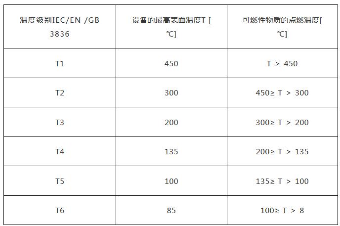 電氣設(shè)備按其最高表面溫度分為 T1 ~ T6 組,使得對(duì)應(yīng)的 T1 ~ T6 組的電氣設(shè)備的最高表面溫度不能超過對(duì)應(yīng)的溫度組別的允許值。溫度組別、設(shè)備表面溫度和可燃性氣體或蒸汽的引燃溫度之間的關(guān)系如下表所示:
