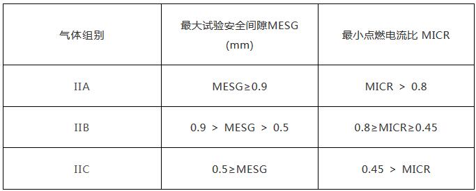 II 類隔爆型電氣設(shè)備或本質(zhì)安全型電氣設(shè)備,按其適用于爆炸性氣體混合物的最大試驗(yàn)安全間隙或最小點(diǎn)燃電流比,進(jìn)一步分為 IIA 、 IIB 和 IIC 類。如下表所示:
