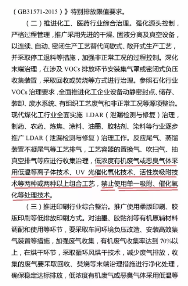 其他行業如印刷、涂裝等行業也有類似VOCs治理技術要求的表述。其實,這也回到2017年曾經火熱的話題,到底但一吸附或者光氧化、等離子的處理效率及安全性如何,我們還應該理性看待。可以看看近些年別的地區對這類所謂的底端工藝的要求及評價。