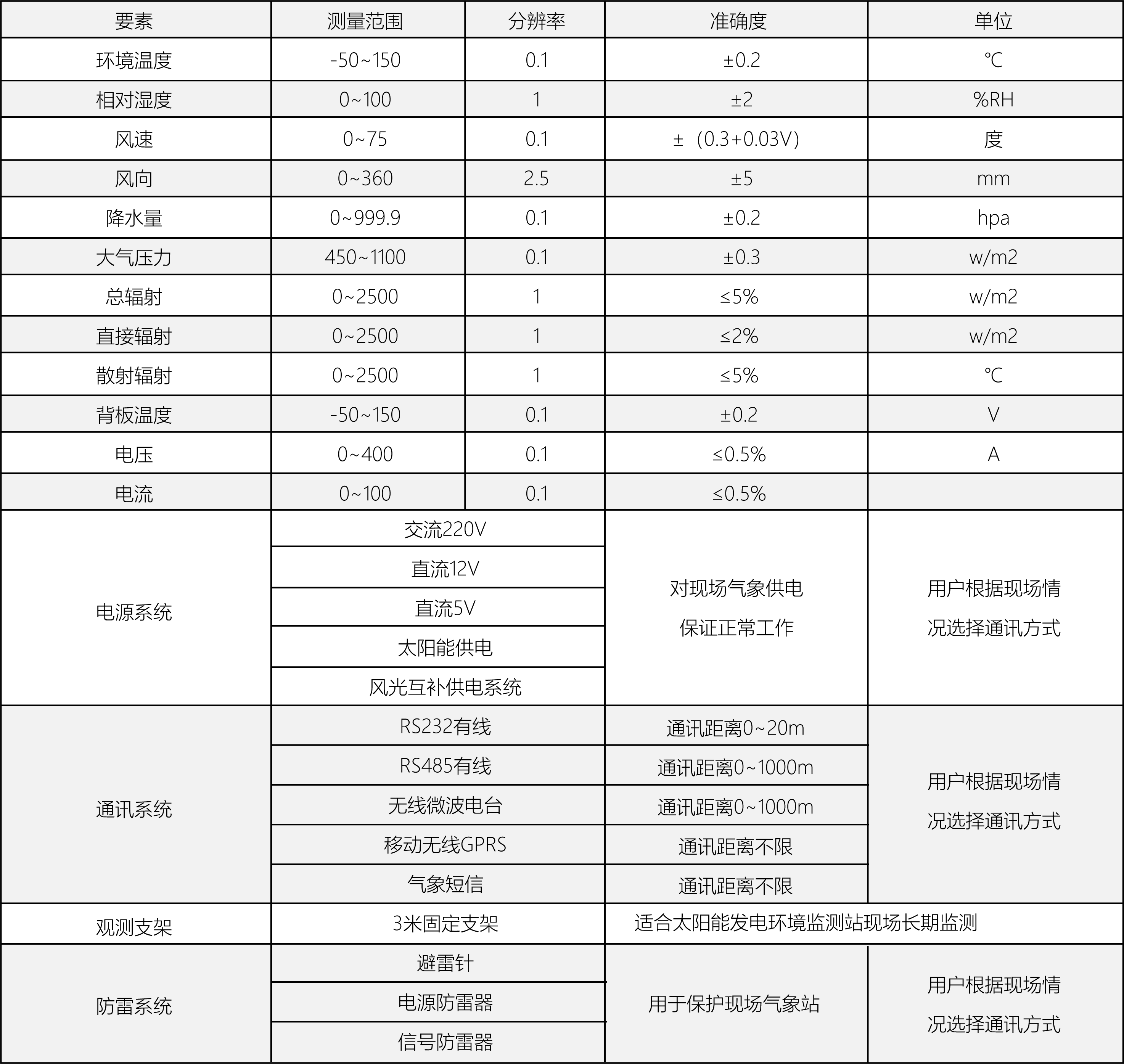 ZK-GF10A光伏氣象站太陽能發電環境監測站是按照國際氣象WMO組織氣象觀測標準和IEC(國際電工技術委員會)規范標準設計、生產的標準環境監測站,同時也符合《并網光伏發電系統工程驗收技術規范》要求。本自動站可觀測的氣象要素有:環境溫度、環境濕度、露點溫度、風速、風向、氣壓、太陽總輻射等多項指標。具有性能穩定,檢測精度高,無人值守等特點,可滿足專業氣象觀測的業務要求。