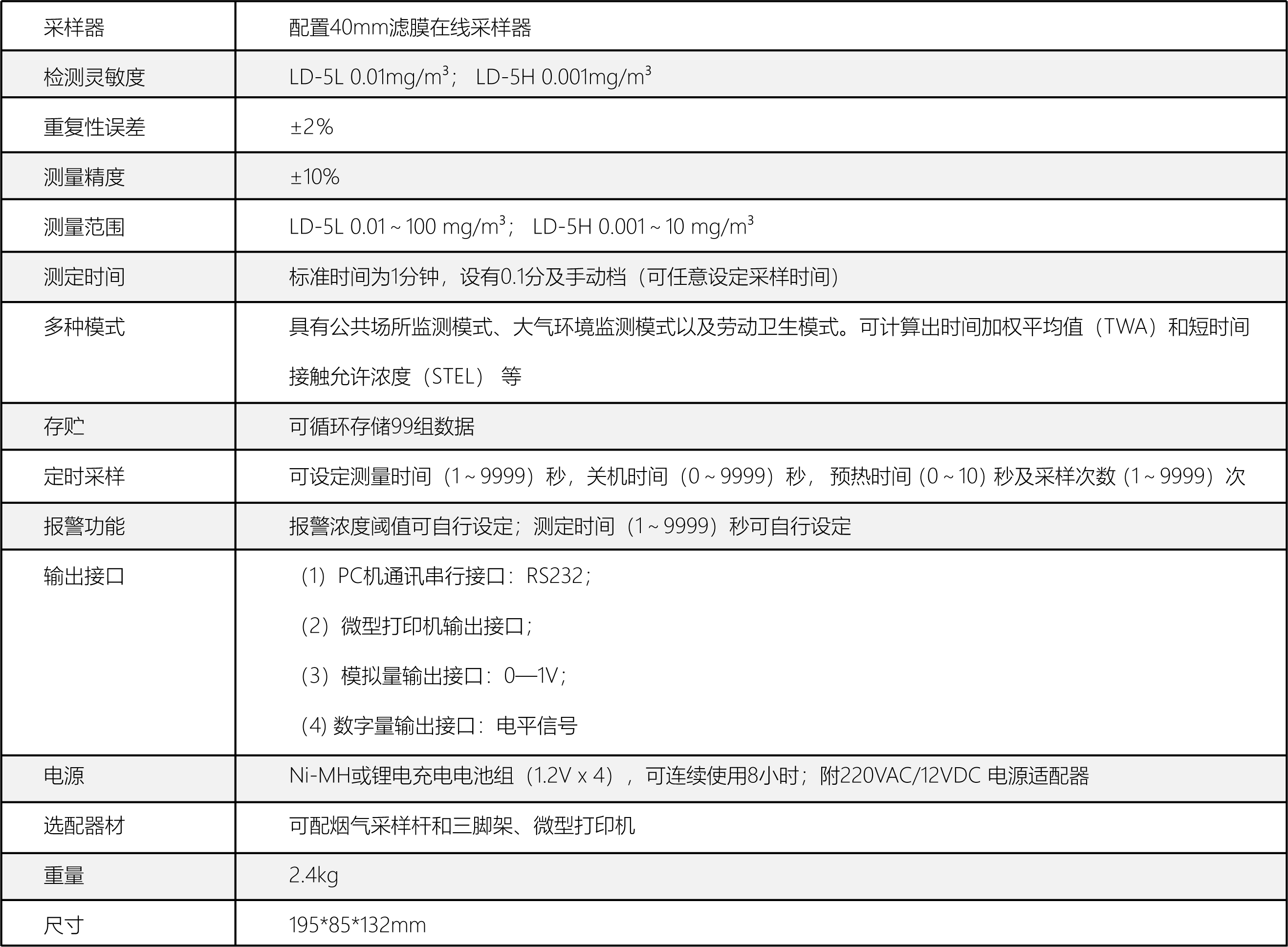 LD-5H/L型激光粉塵儀是以激光微光源的光散射式快速測塵儀。可直讀顆粒物質量濃度,1分鐘出結果,或根據用戶需要任意設定采樣時間;內置濾膜采樣裝置,在連續監測粉塵 濃度的同時,可收集顆粒物,以便對其成份進行分析,并求出質量濃度轉換系數K值。內置的過濾裝置,避免粉塵對儀器部件的影響,延長儀器使用壽命;具有自校 系統;具有氣幕屏蔽及潔凈氣自清洗功能,確保光學系統不受污染;實現了軟件自動調零;具有與計算機雙向通訊功能,可通過PC機進行數據處理,打印出曲線及表格。
