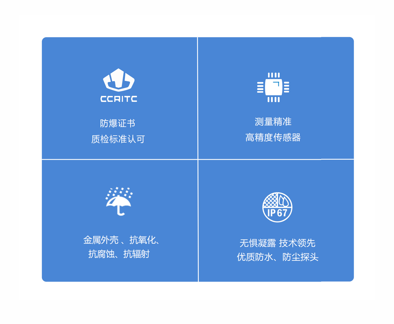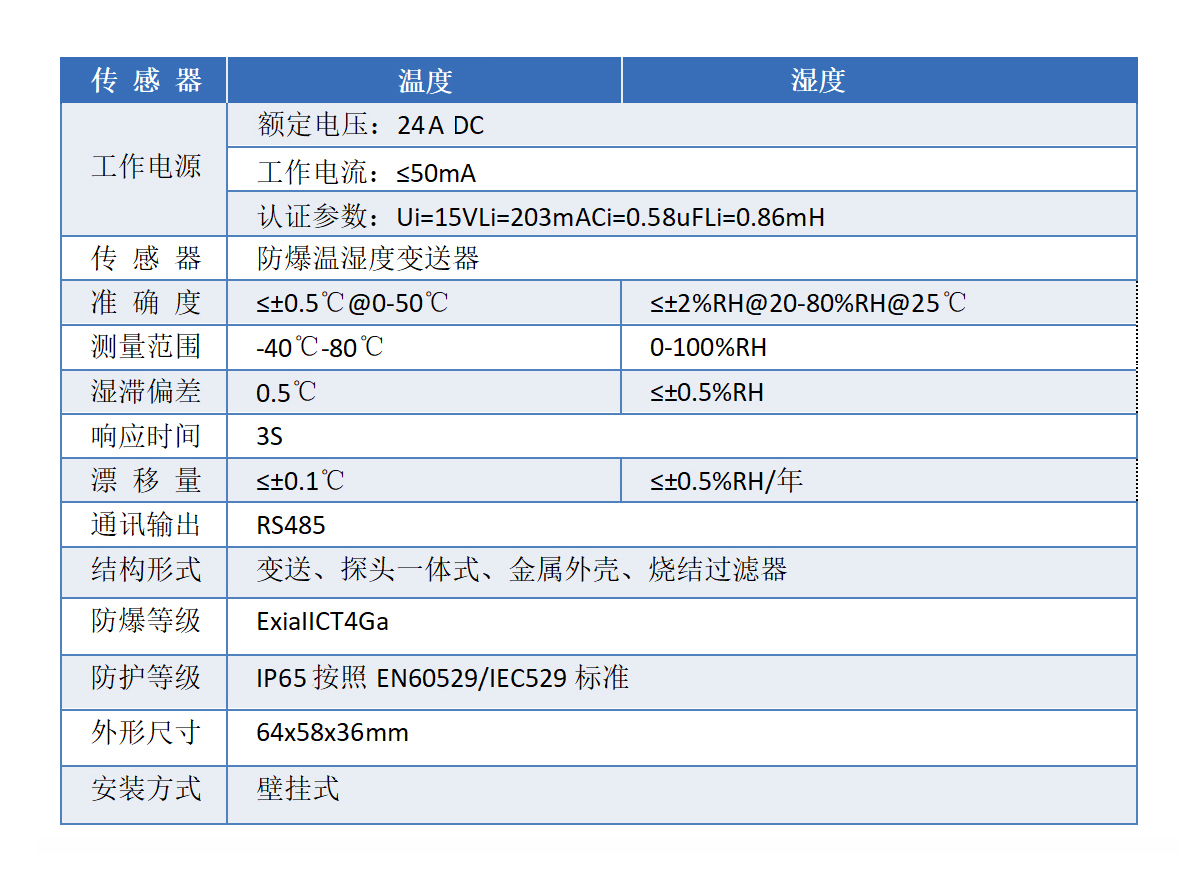 ZK-FBWSD型防爆溫濕度變送器采用一體式設(shè)計(jì),標(biāo)準(zhǔn)RS485通信接口,本品采用遞推平均數(shù)字軟件濾波與硬件電路濾波相結(jié)合的濾波方法,使外界對(duì)采樣的干擾盡可能降到最低,全量程精度高、穩(wěn)定性能強(qiáng)、一致性好、響應(yīng)速度快,電路采用全金屬外殼,探頭采用燒結(jié)工藝金屬外殼,符合國(guó)家防爆標(biāo)準(zhǔn)并檢驗(yàn)合格,與防爆安全柵配套使用,用于特殊易爆環(huán)境的溫濕度測(cè)量如石油化工廠、彈藥庫(kù)、粉塵車間等。